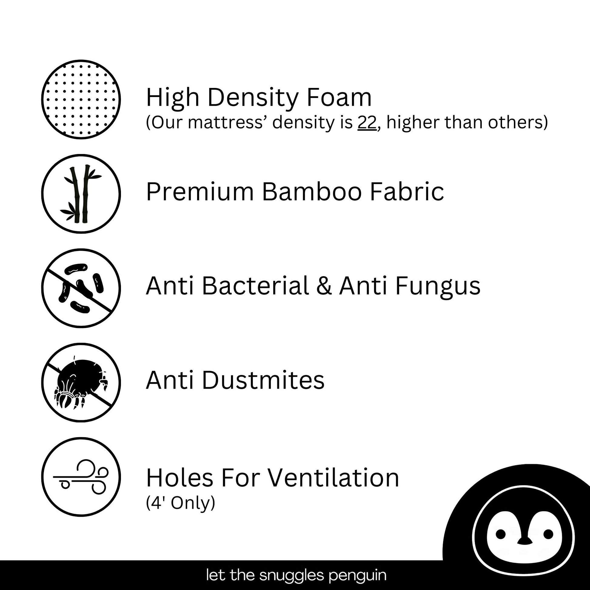 Made with high-density foam, it offers excellent support and durability, ensuring a restful night's sleep. The mattress features premium bamboo fabric, which is naturally soft and breathable. It also boasts anti-bacterial and anti-fungal properties, making it ideal for children with allergies or sensitivities.