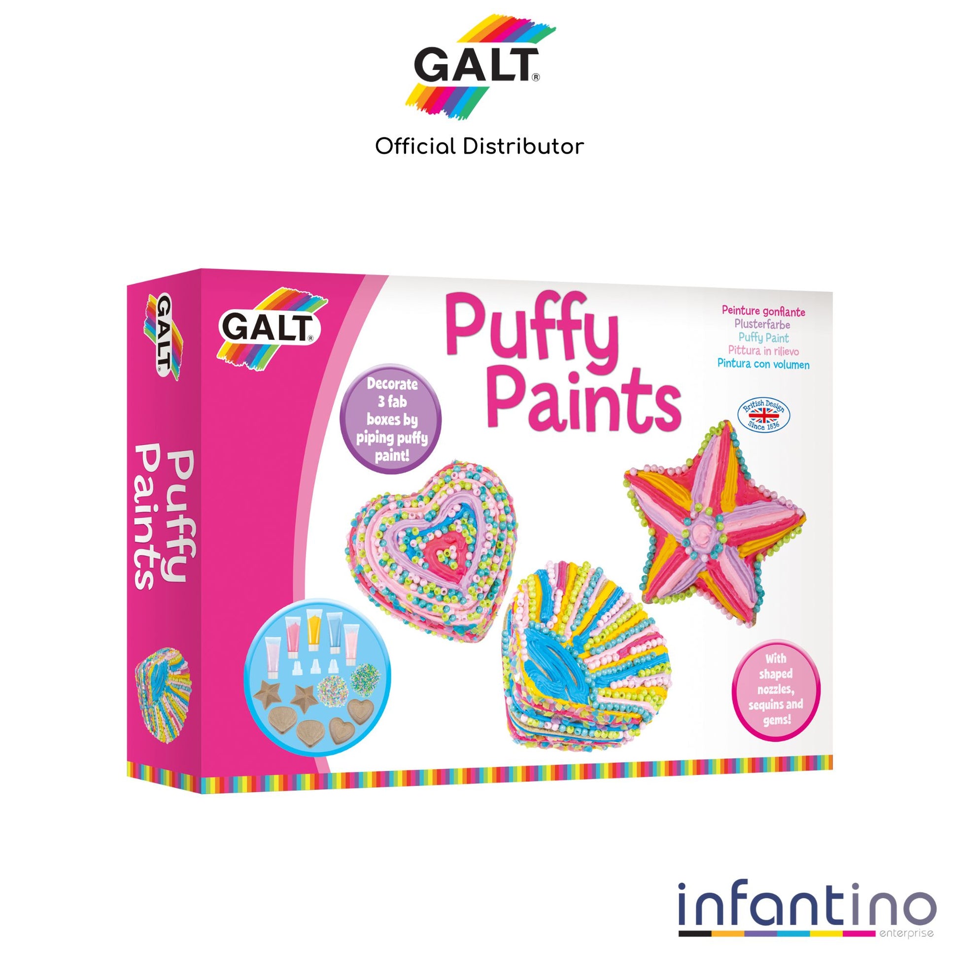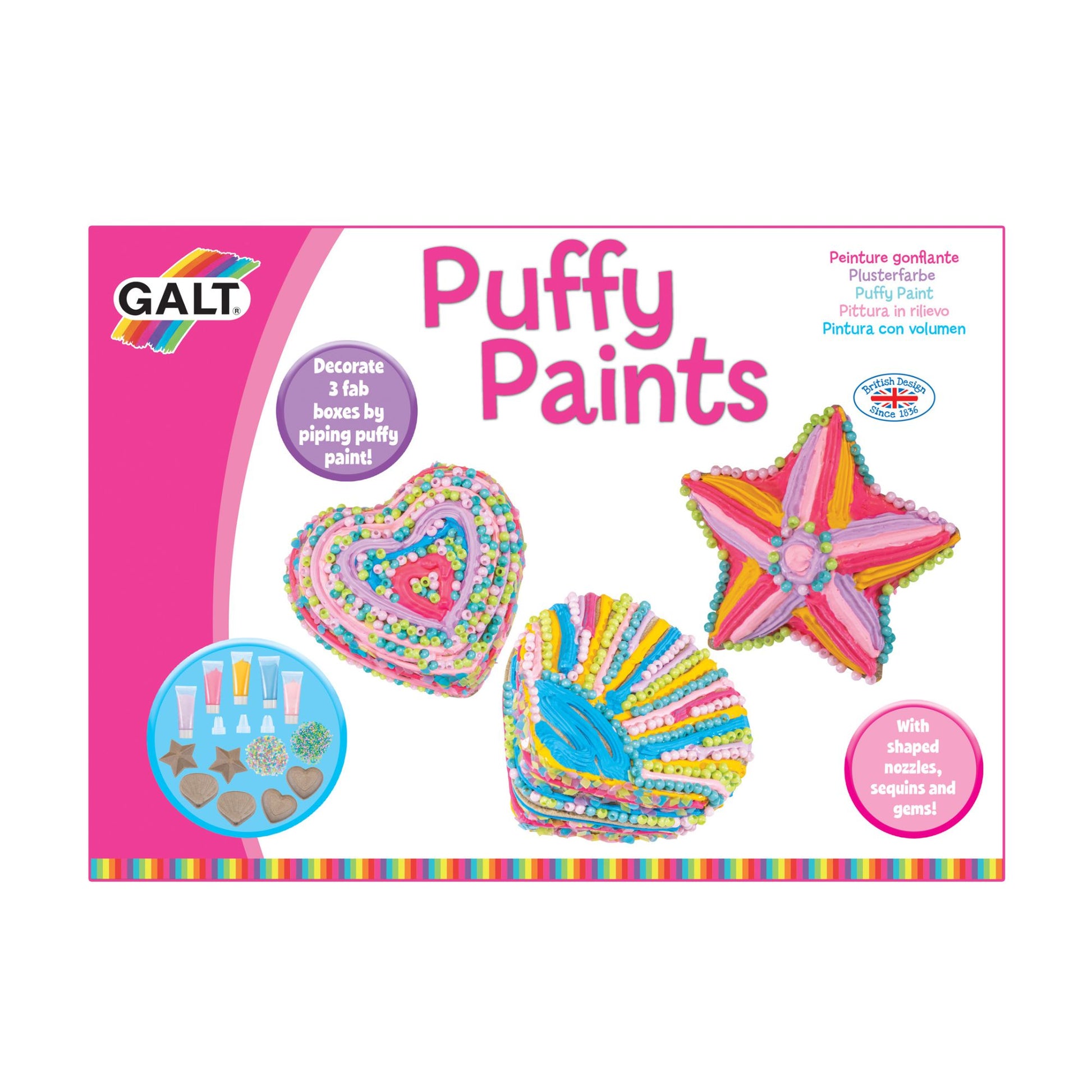 - Includes five puffy paint tubes, three shaped nozzles, three paper moulded shaped boxes, beads, sequins and guide