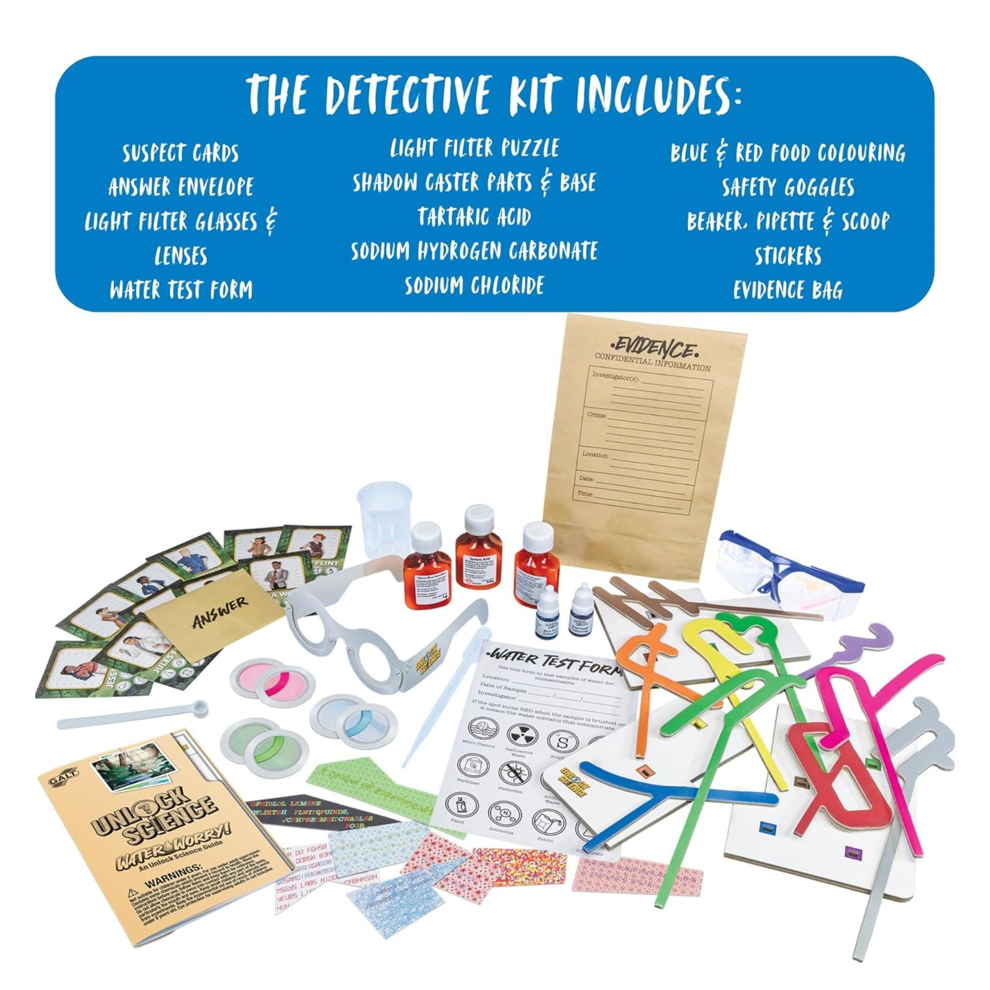 Suspect cards, answer envelope, light filter glasses, light filter lenses, water test form, light filter puzzle, shadow caster parts, shadow caster base, tartaric acid, sodium hydrogen carbonate, sodium chloride, blue food colouring, red food colouring, safety goggles, beaker, pipette, scoop, “1” & “2” stickers and evidence bag.