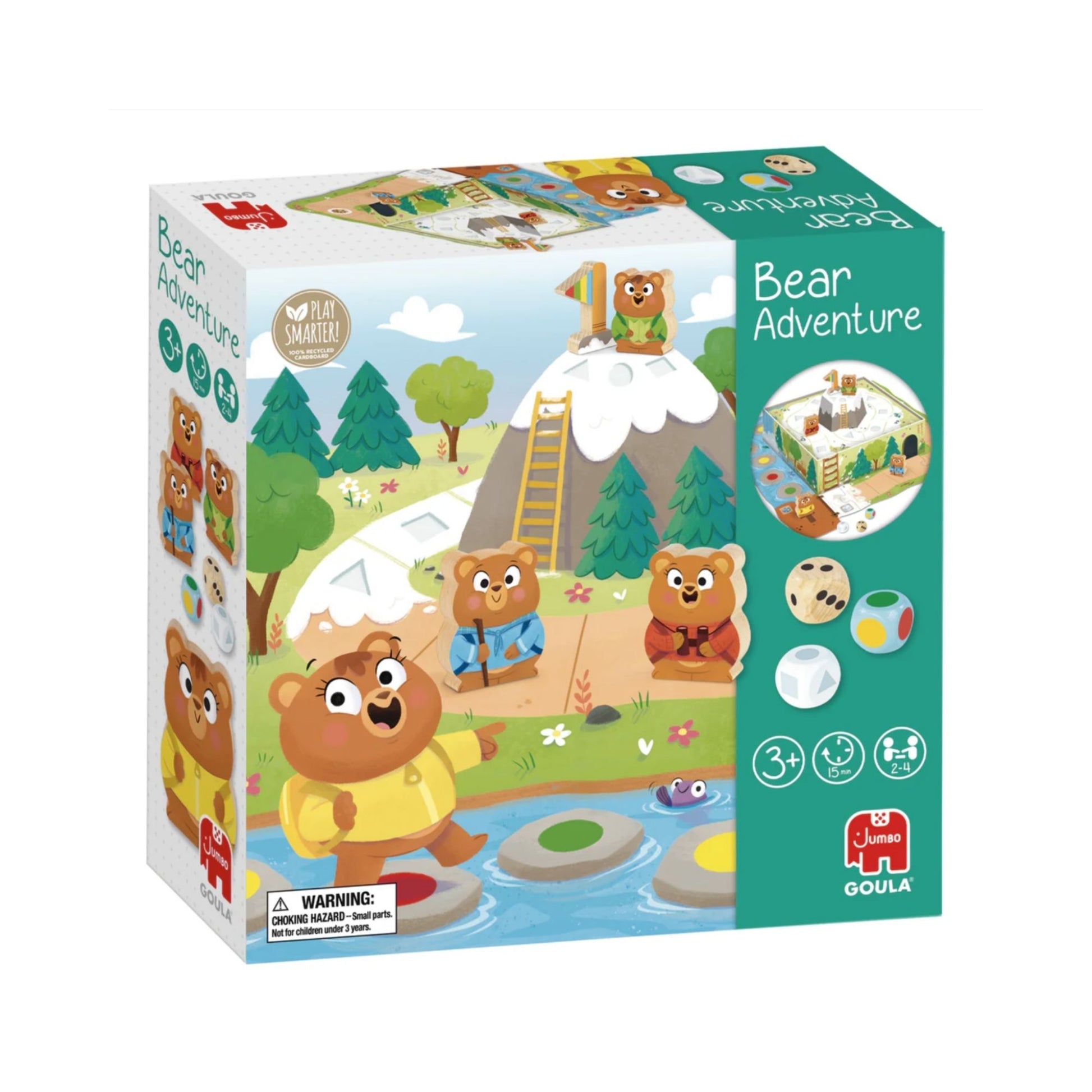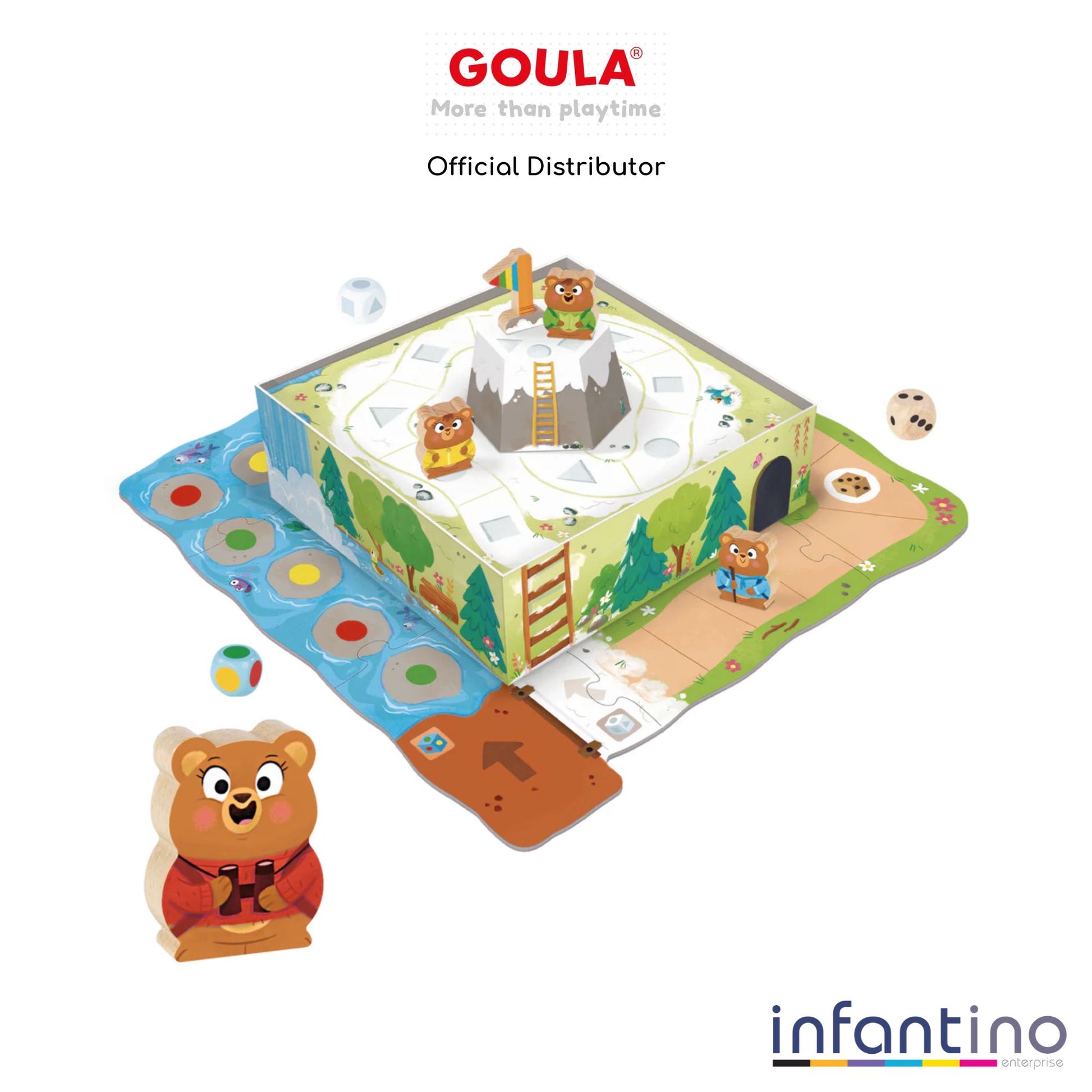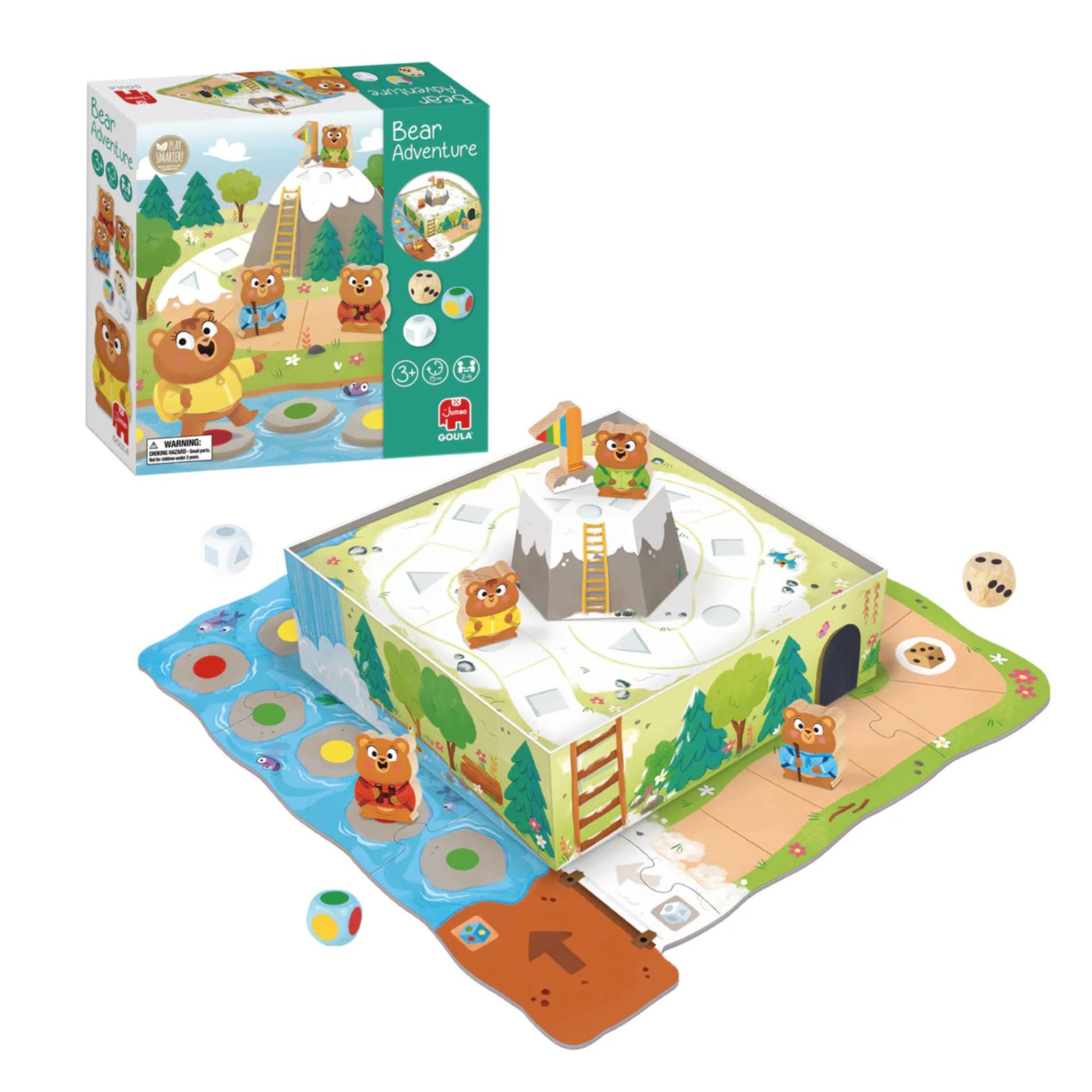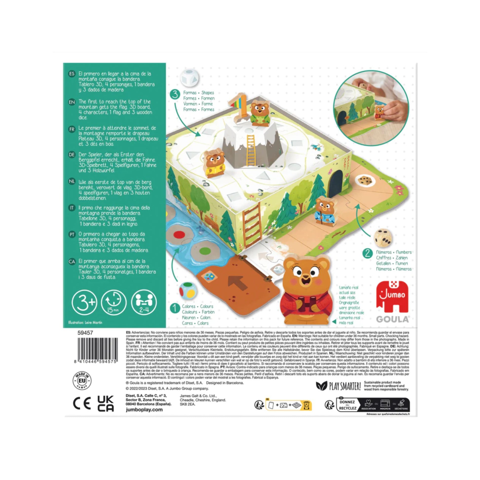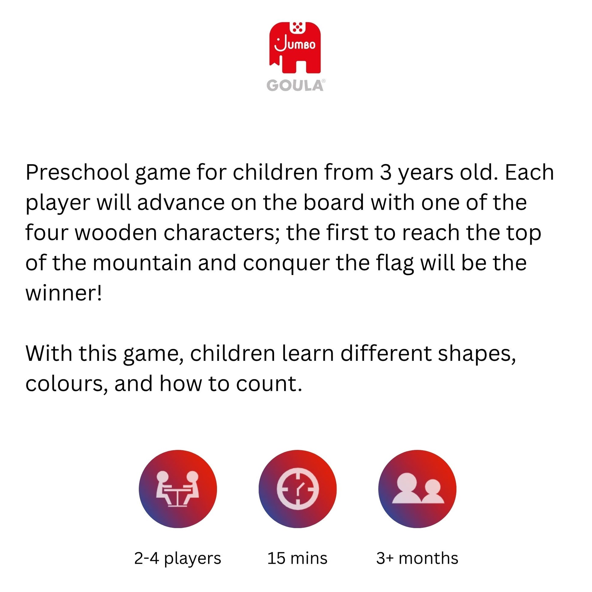 Preschool game for children from 3 years old. Each player will advance on the board with one of the four wooden characters; the first to reach the top of the mountain and conquer the flag will be the winner!