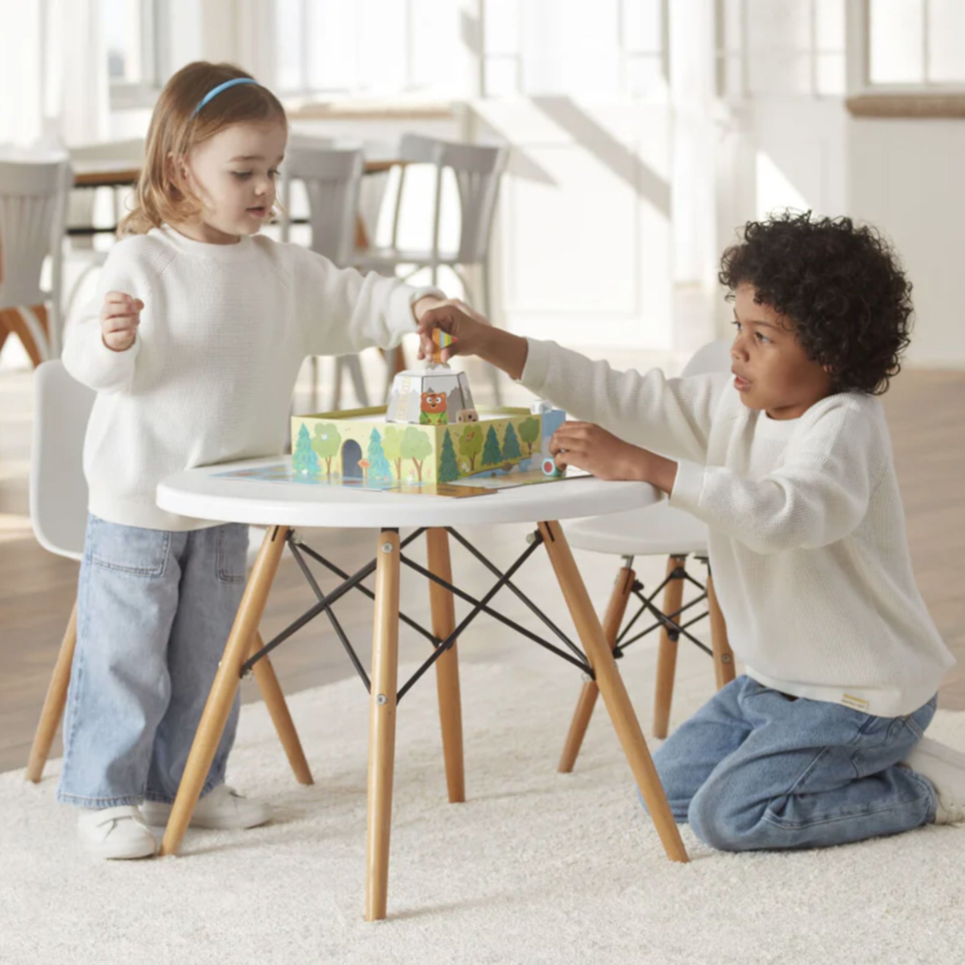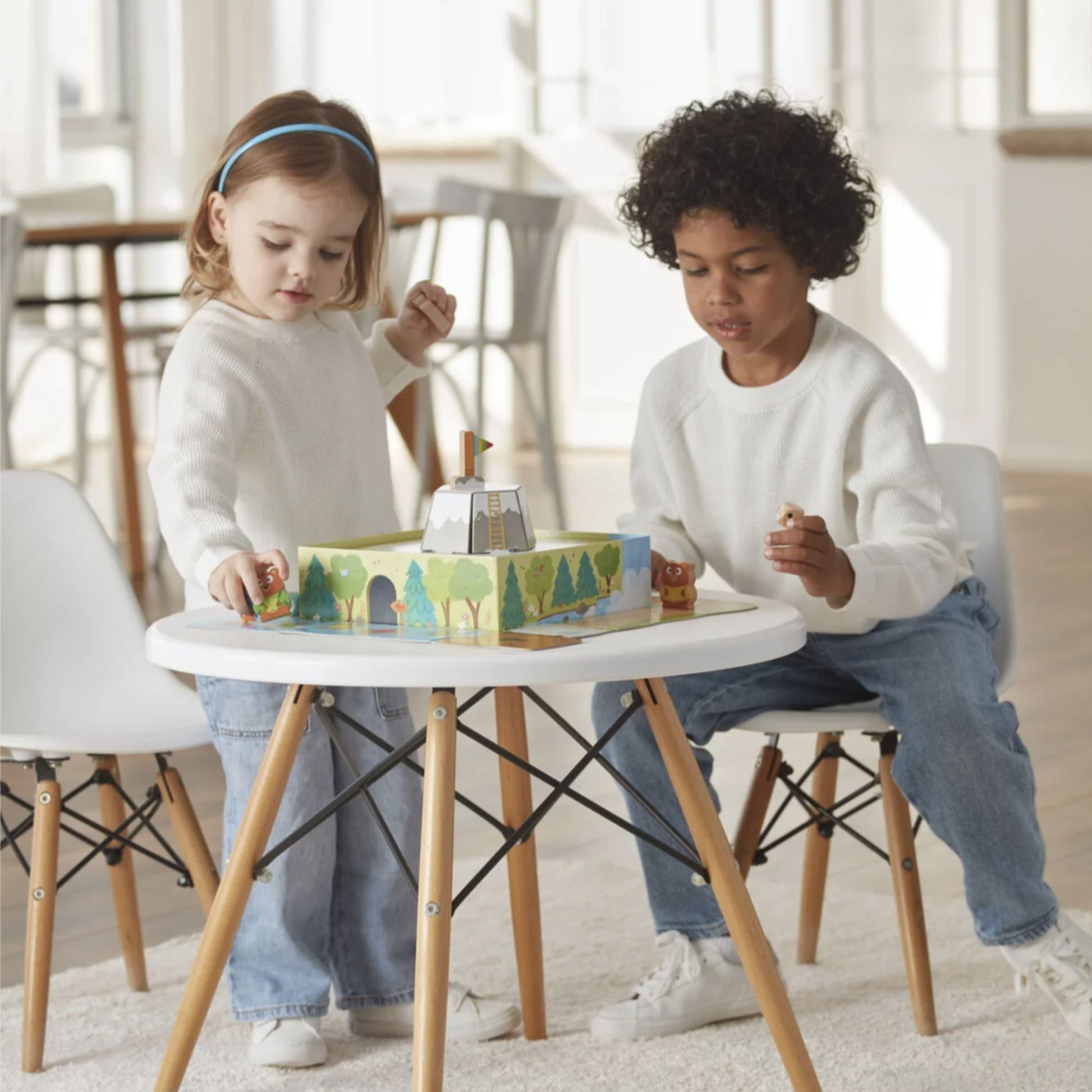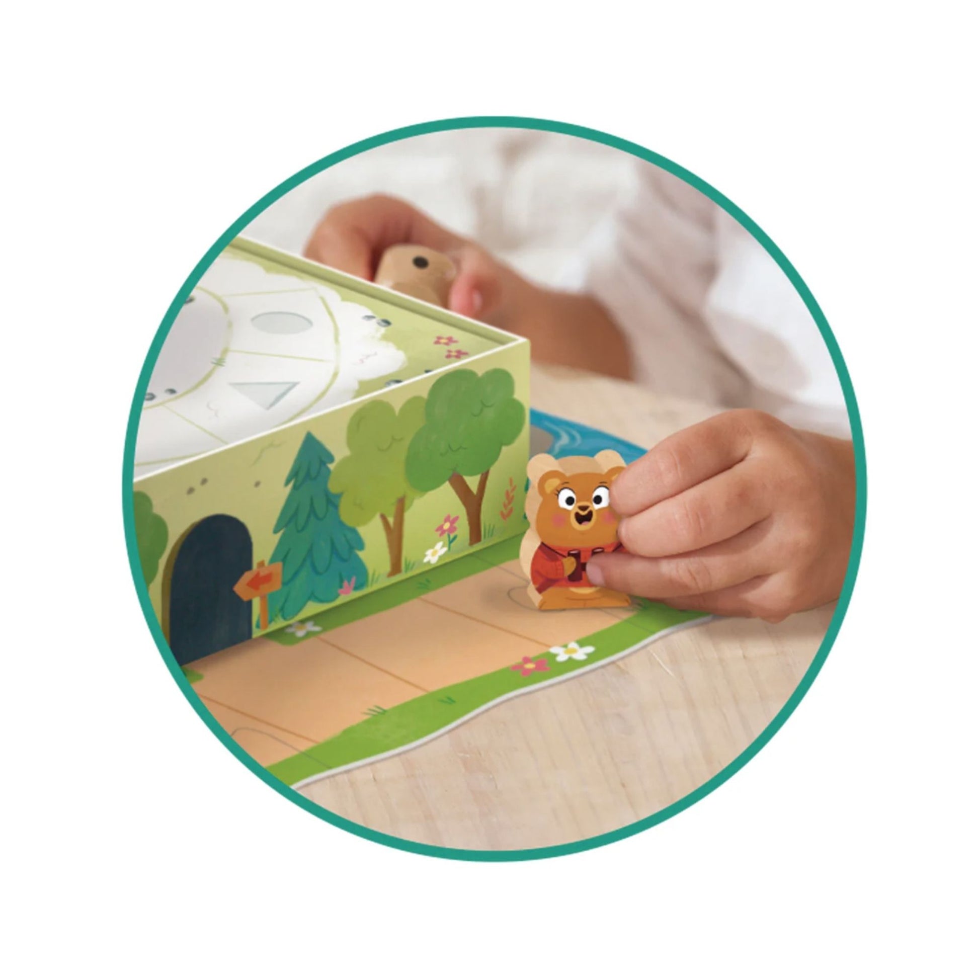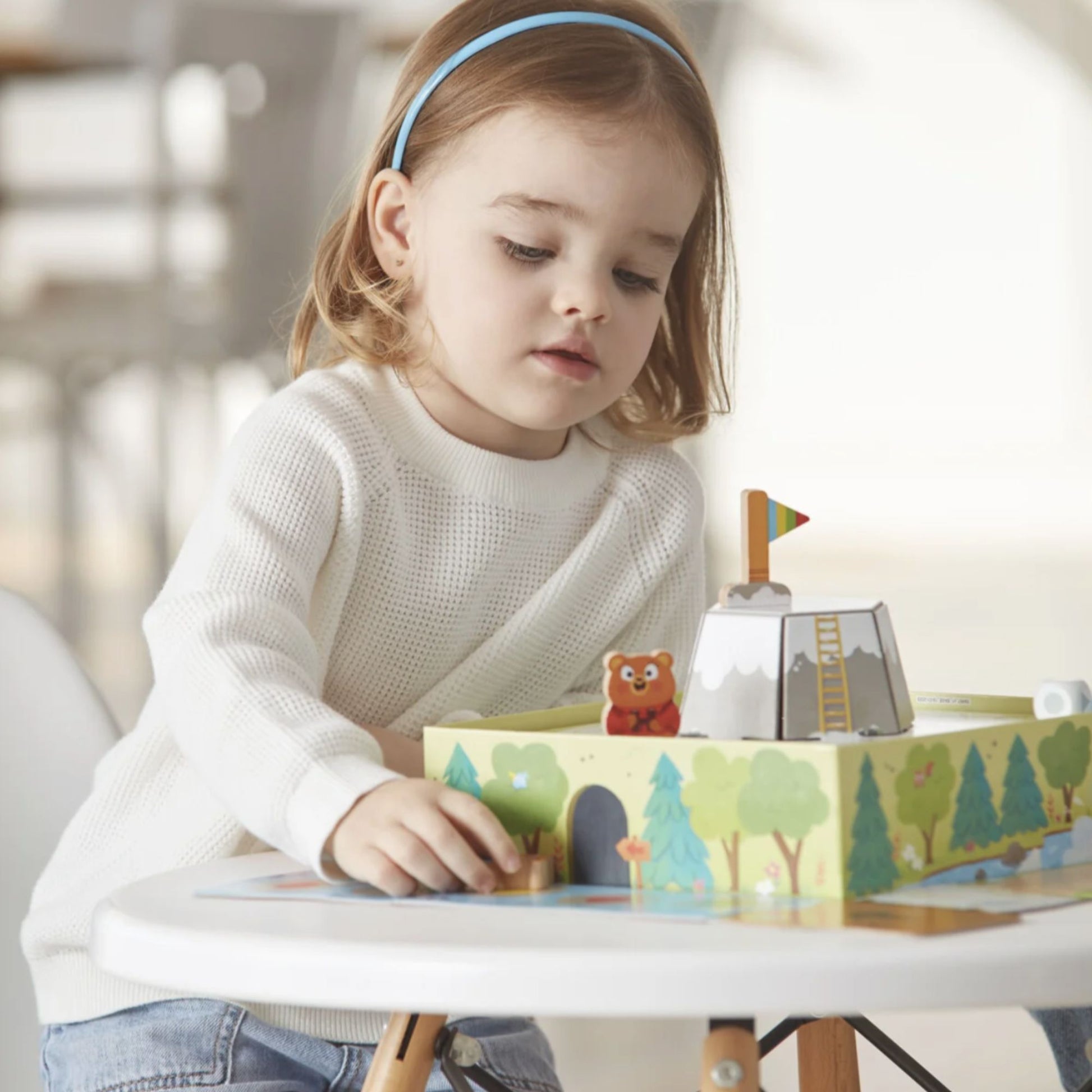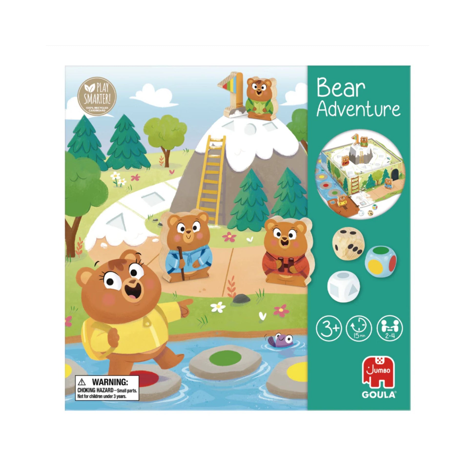 Preschool game for children from 3 years old. Each player will advance on the board with one of the four wooden characters; the first to reach the top of the mountain and conquer the flag will be the winner!