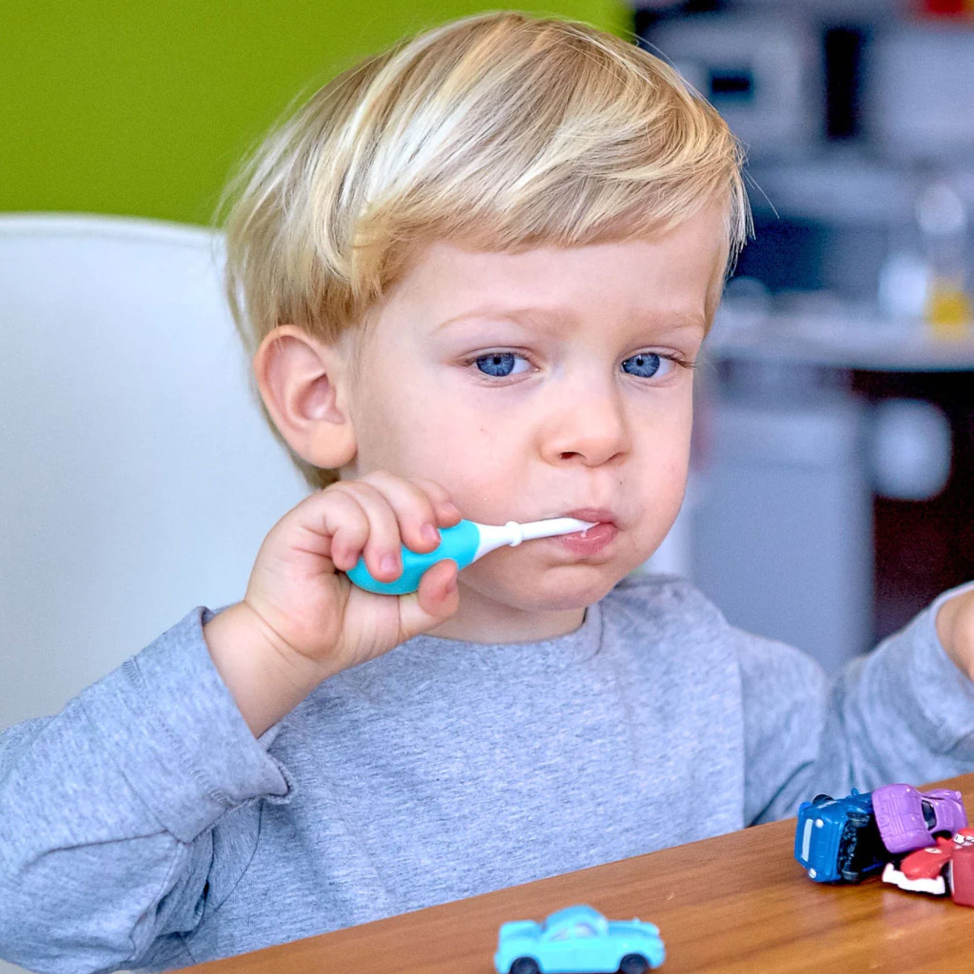 Marcus & Marcus’ 3-Stage Palm Grasp Toothbrush Brush Set was designed with little hands and little mouths in mind. This Toddler Toothbrush is the perfect training tool for little ones before they move on to our Kid’s Oral Care Sets. The round palm grasp is designed for your little one’s developing vice grip and the small brush head is perfect for little mouths. The extra soft nylon bristles are cut in a convex shape for the best care and comfort of little teeth. Our Palm Grasp Toothbrush features a three stage system to grow with your little one. Stage 1 is the short brush with the protection shield. Stage 2 is the long brush with the protection shield. Finally, Stage 3 is the long brush without the protection shield.