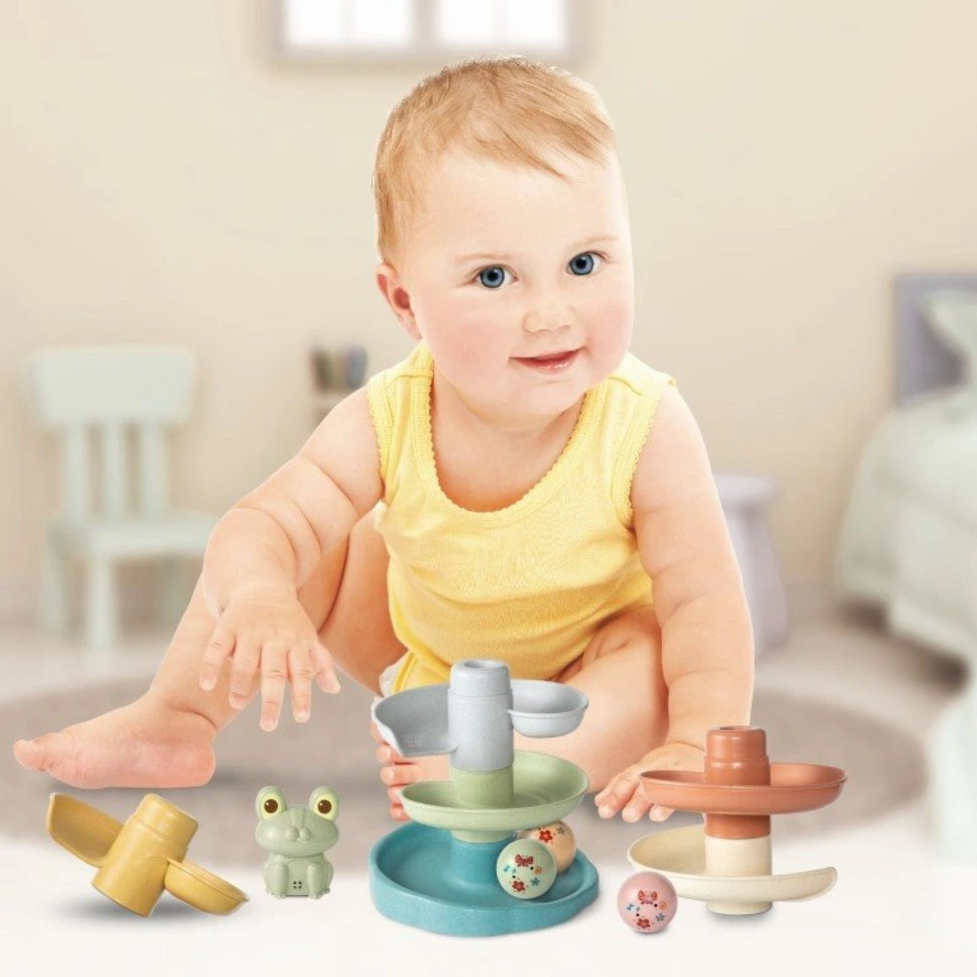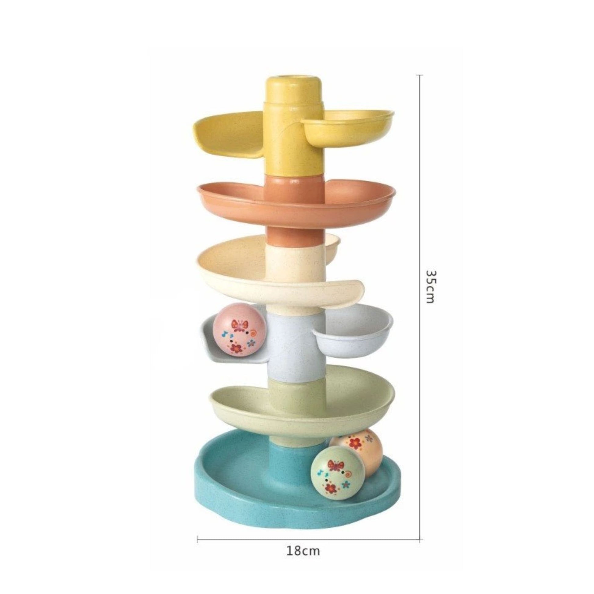 It comes with 3 balls, which rattle when they move. The course consists of 5 floors, which are shaped like a Spiral, and it can be assembled in several different ways.