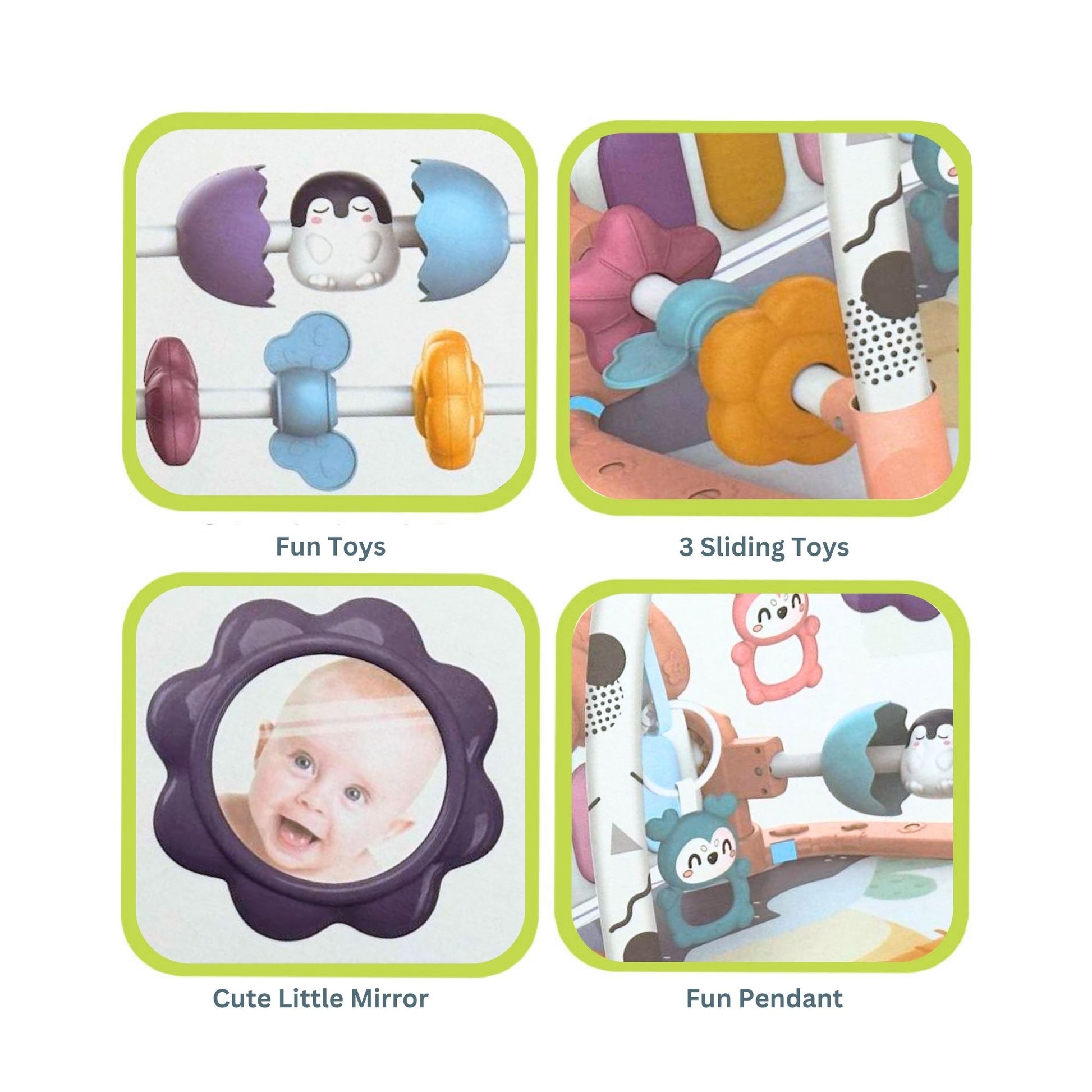 The built-in side rails ensure your baby stays safely within the play zone, while the assortment of hanging and sliding toys captivate their attention and encourage developmental milestones.