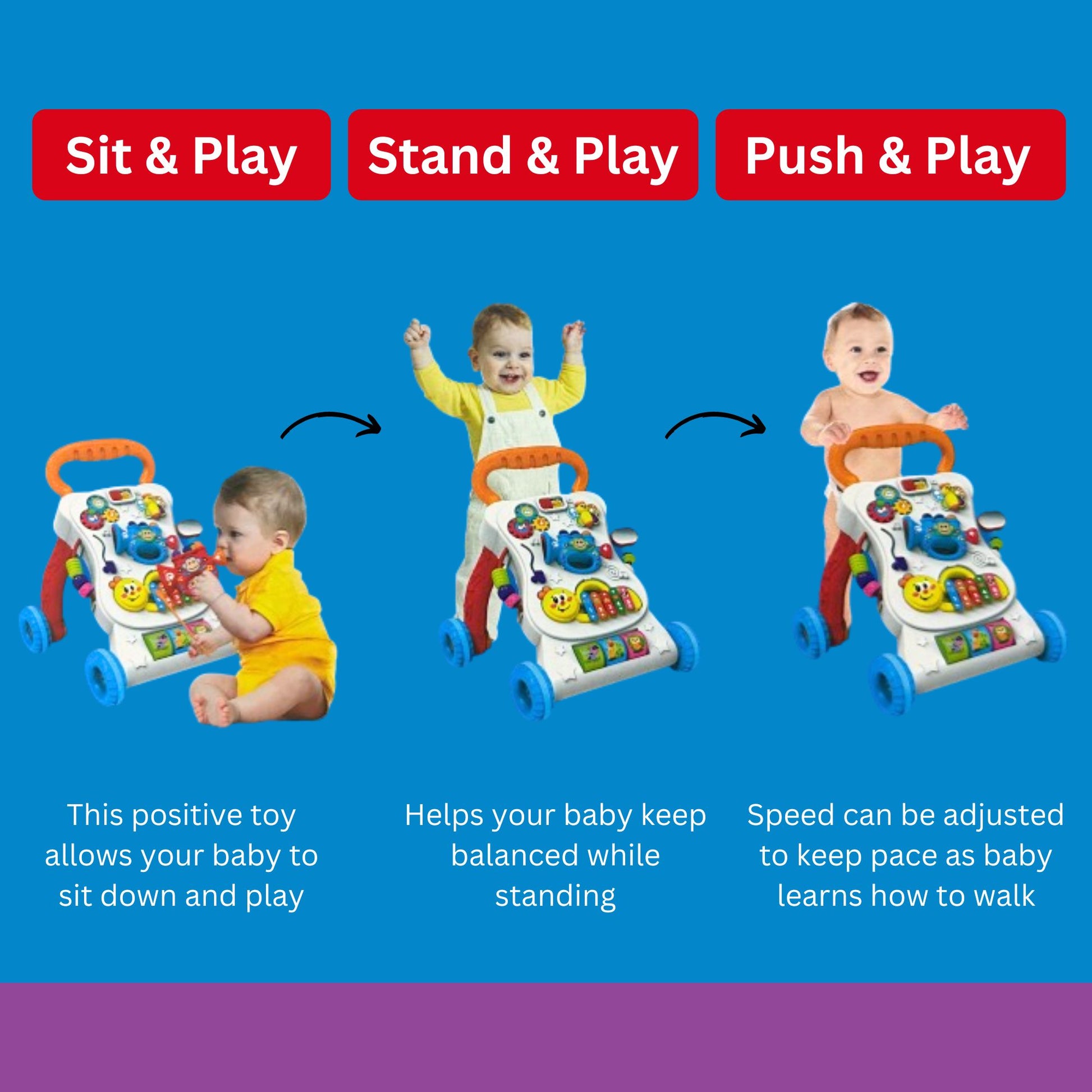 Finally, the 'Push & Play' mode transforms the walker into a stable support for those first precious steps, with adjustable speed wheels to match your little ones’ as they progress.