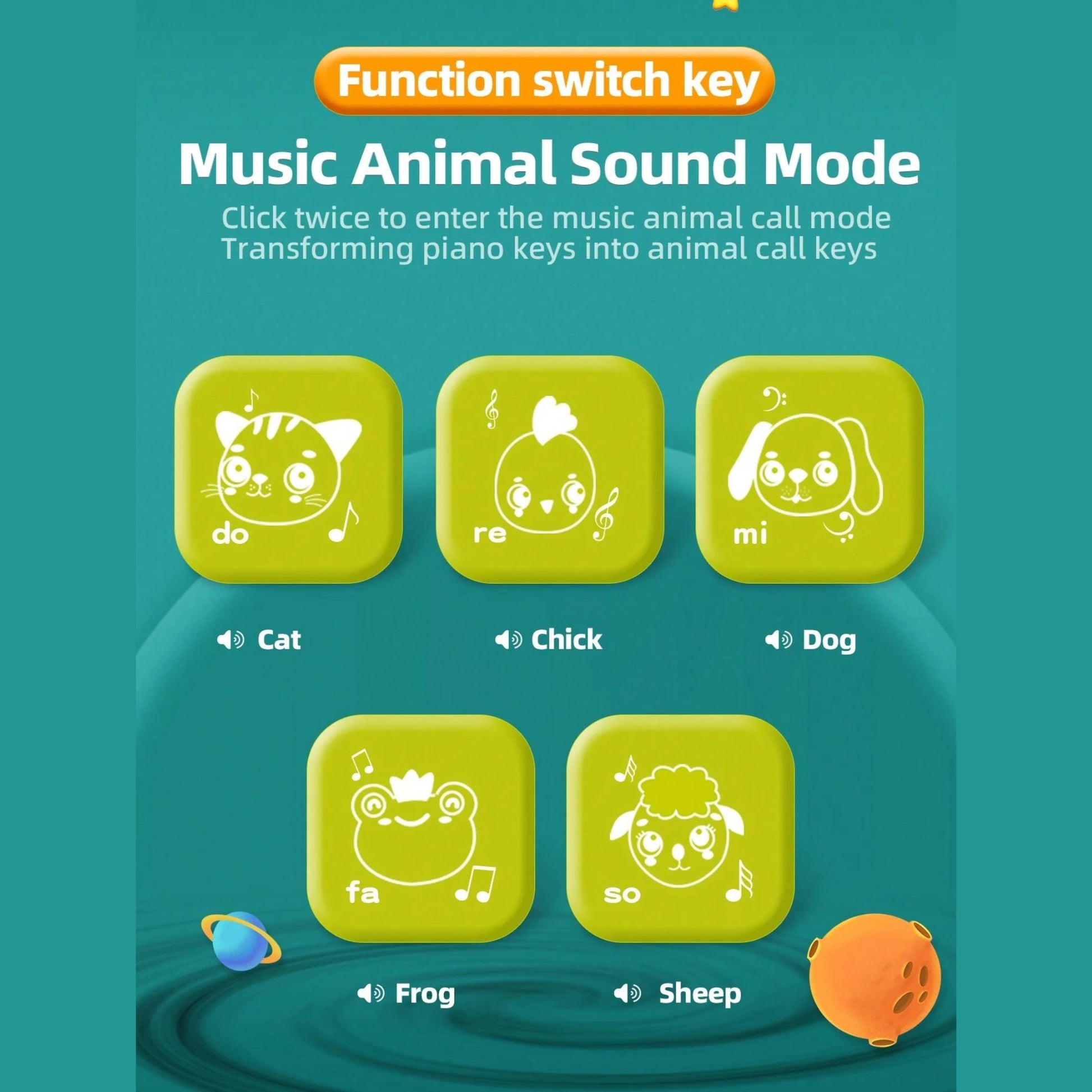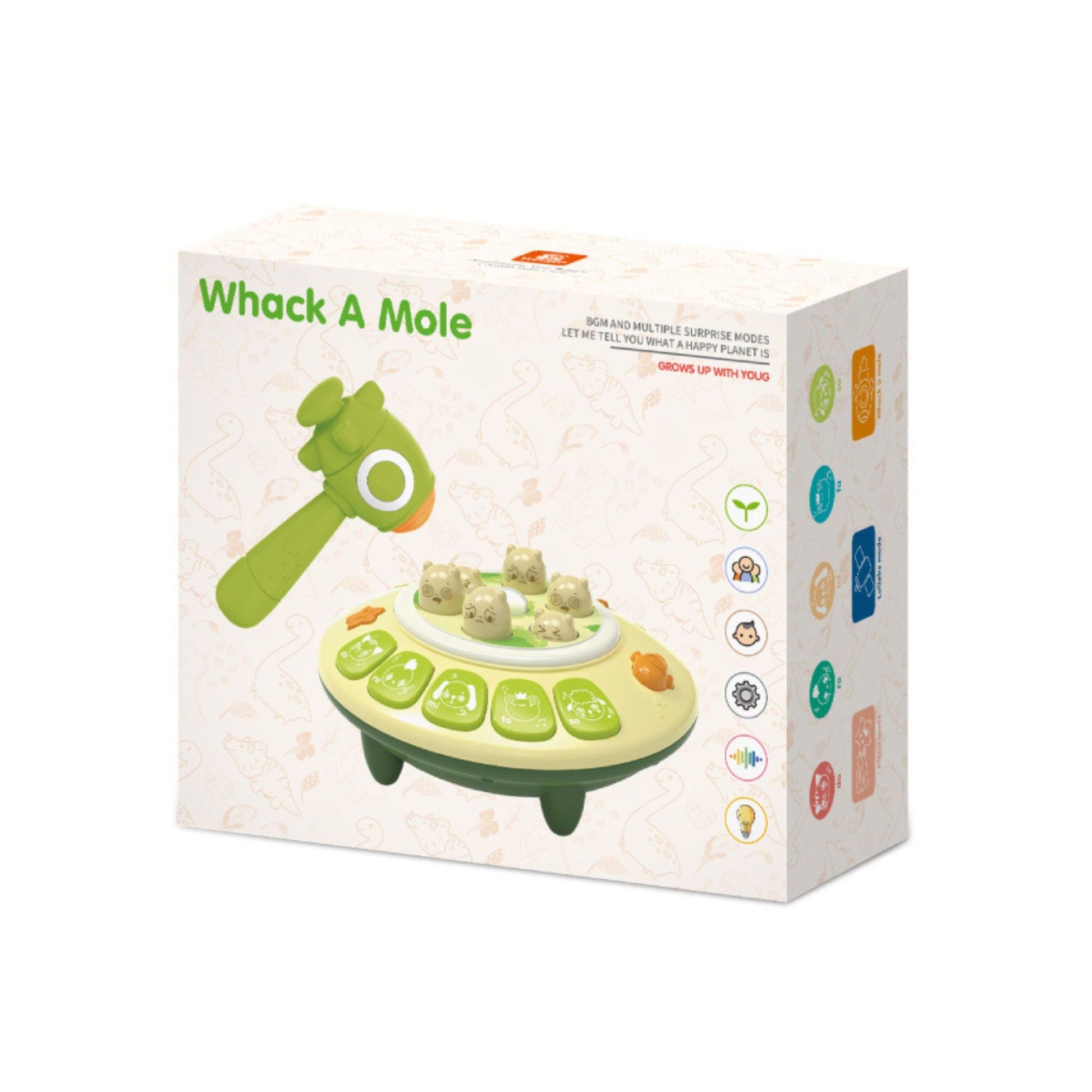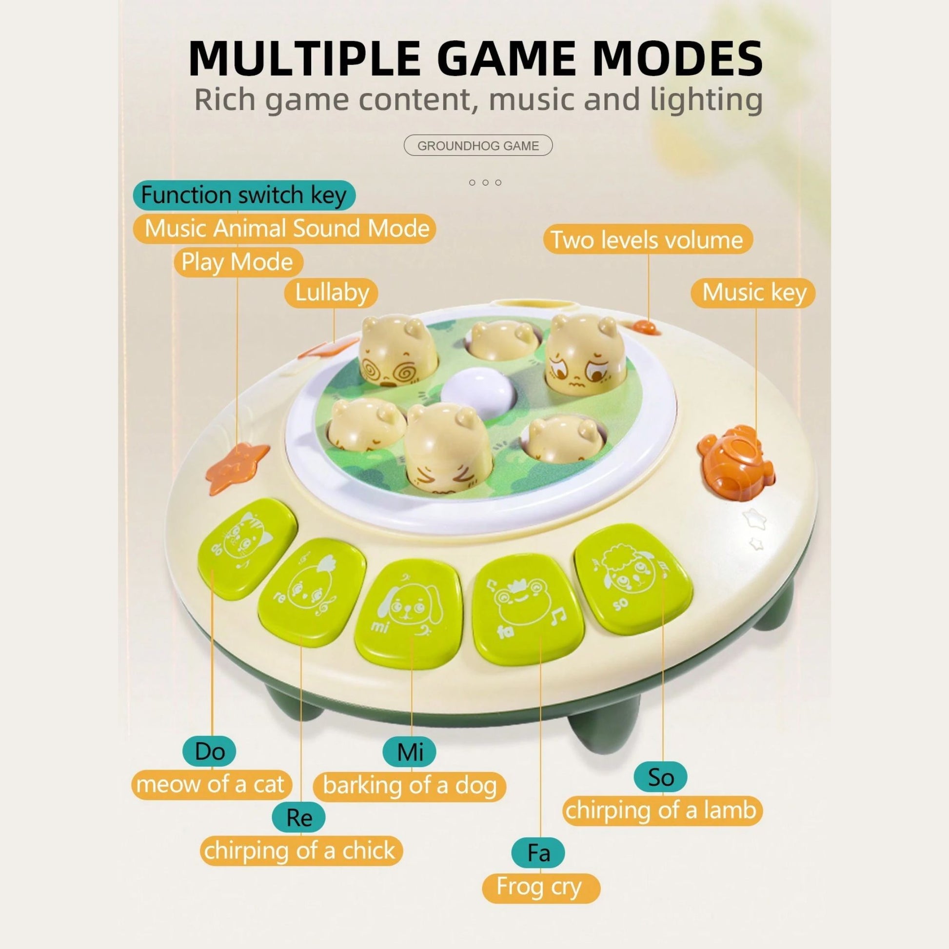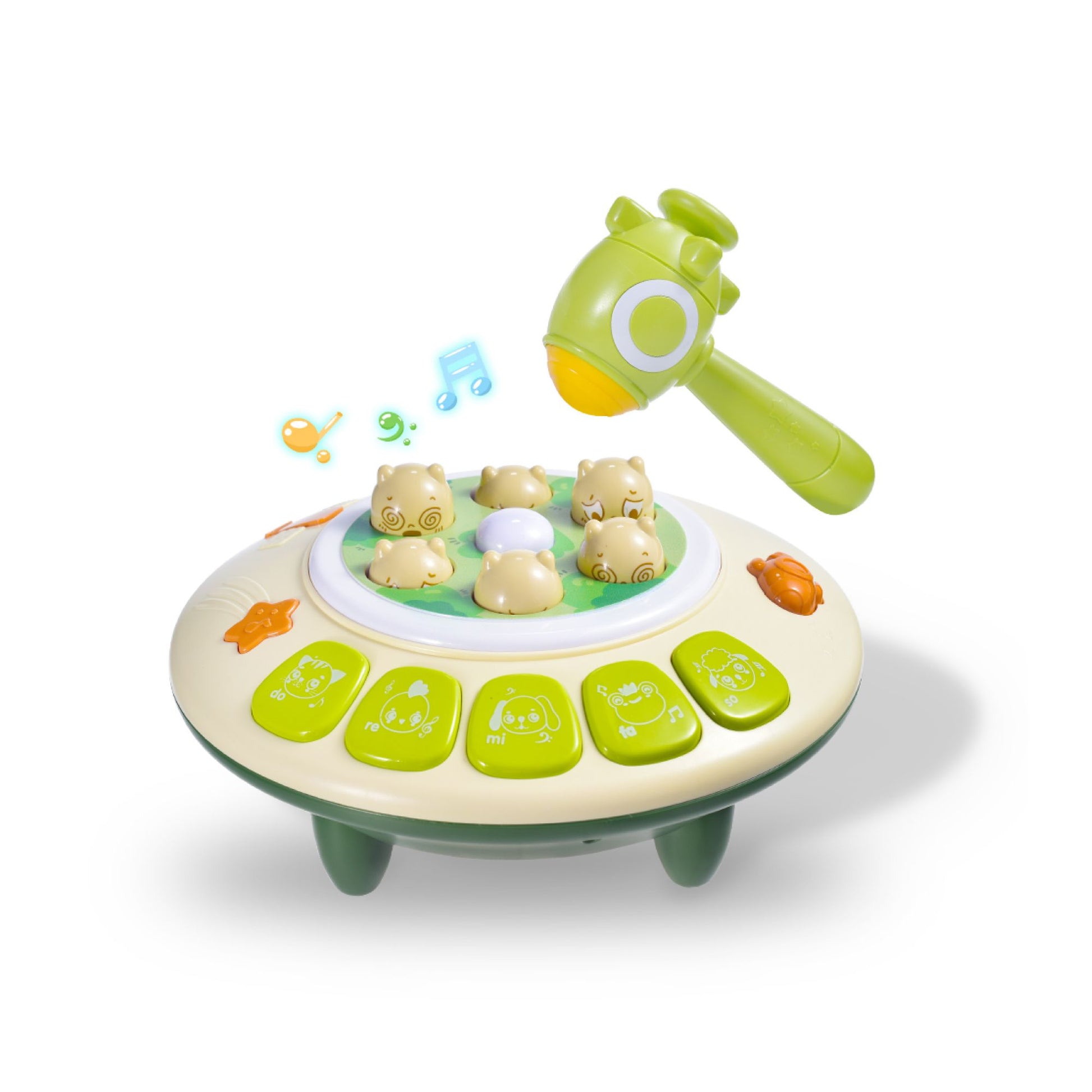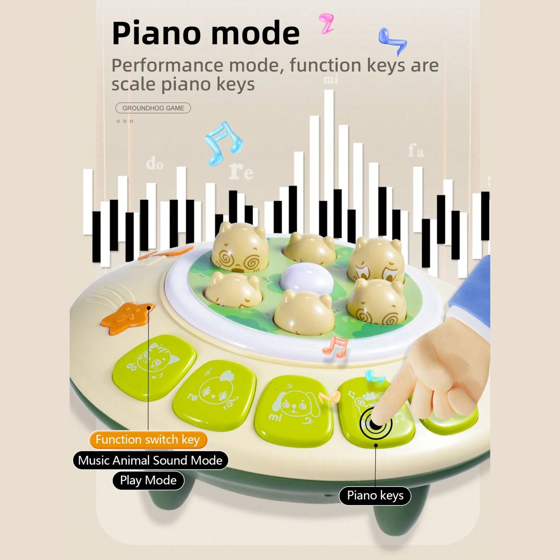 This vibrant set is not just a game; it's a dynamic play experience that offers three engaging modes. First, the classic Whack A Mole mode, where players can test their reflexes and aim to score the highest by swiftly whacking the moles that pop up. Then, switch to the Animal Sounds mode, perfect for the little ones to learn and giggle as they identify various animal noises. Lastly, the Piano mode transforms the set into a musical playground, allowing kids to create their own melodies.