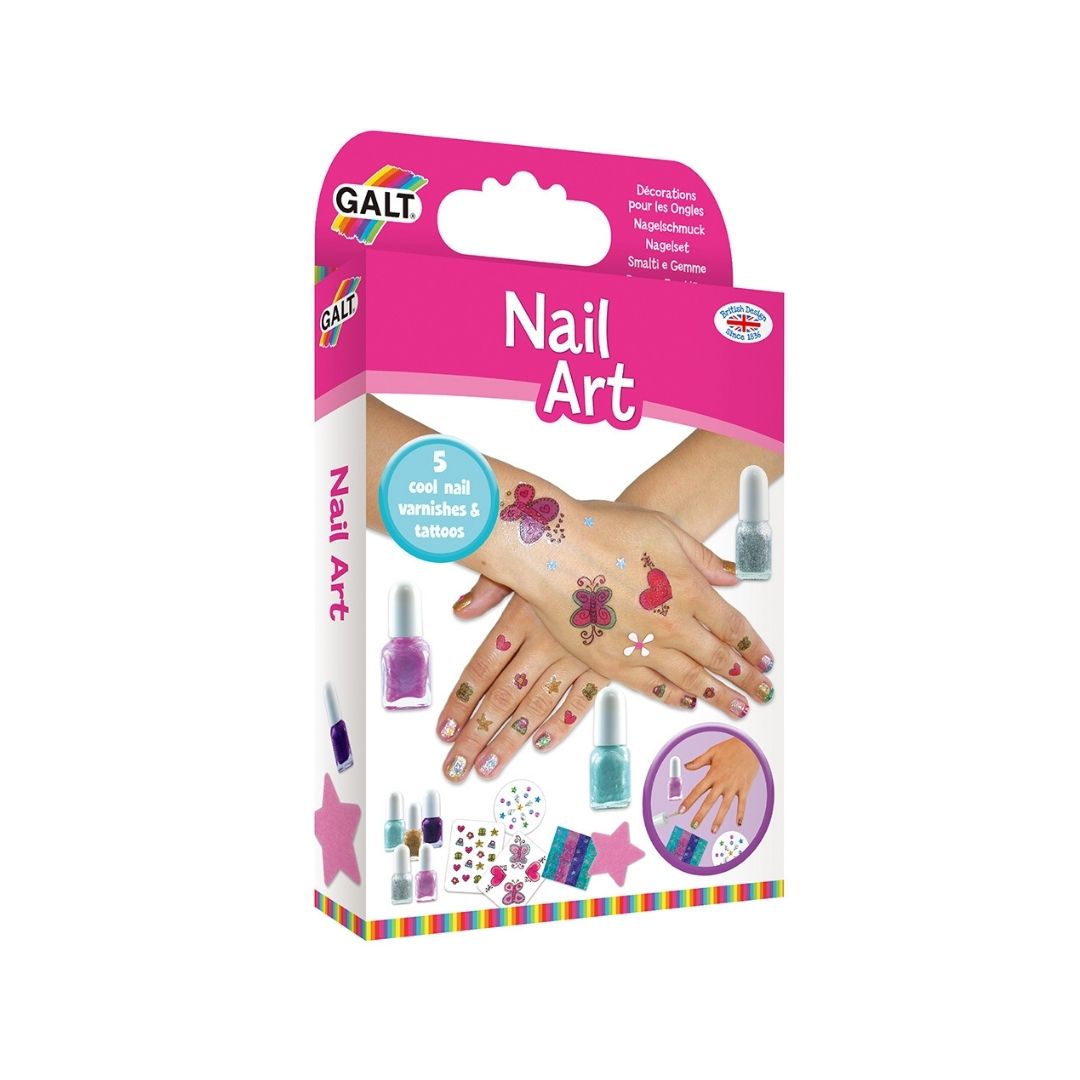 - 3 coloured nail varnishes, 2 glitter nail varnishes, nail gems, holographic strips, tattoos and star-shaped emery board.