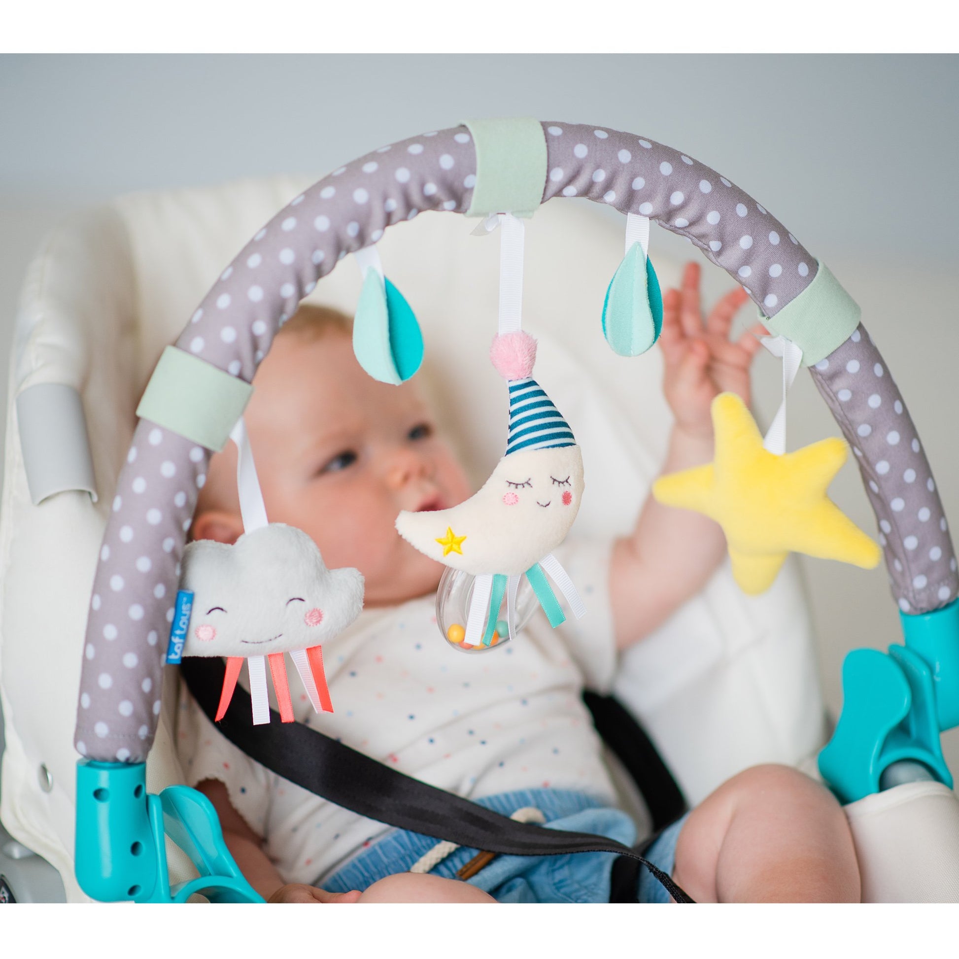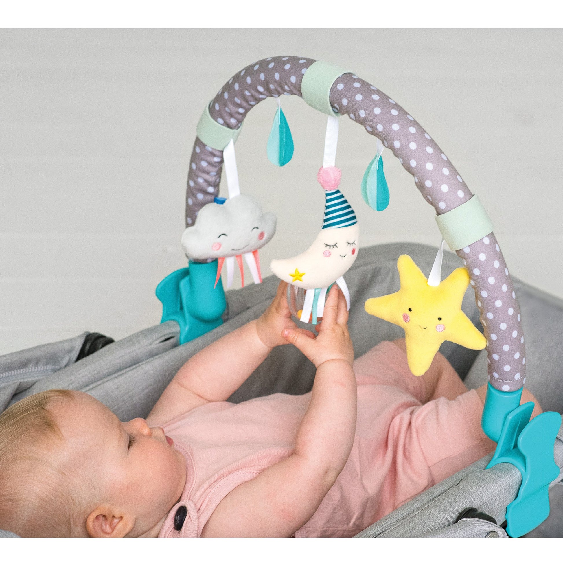 - Soft & flexible pram arch with rattling toys, easy to fold & carry.