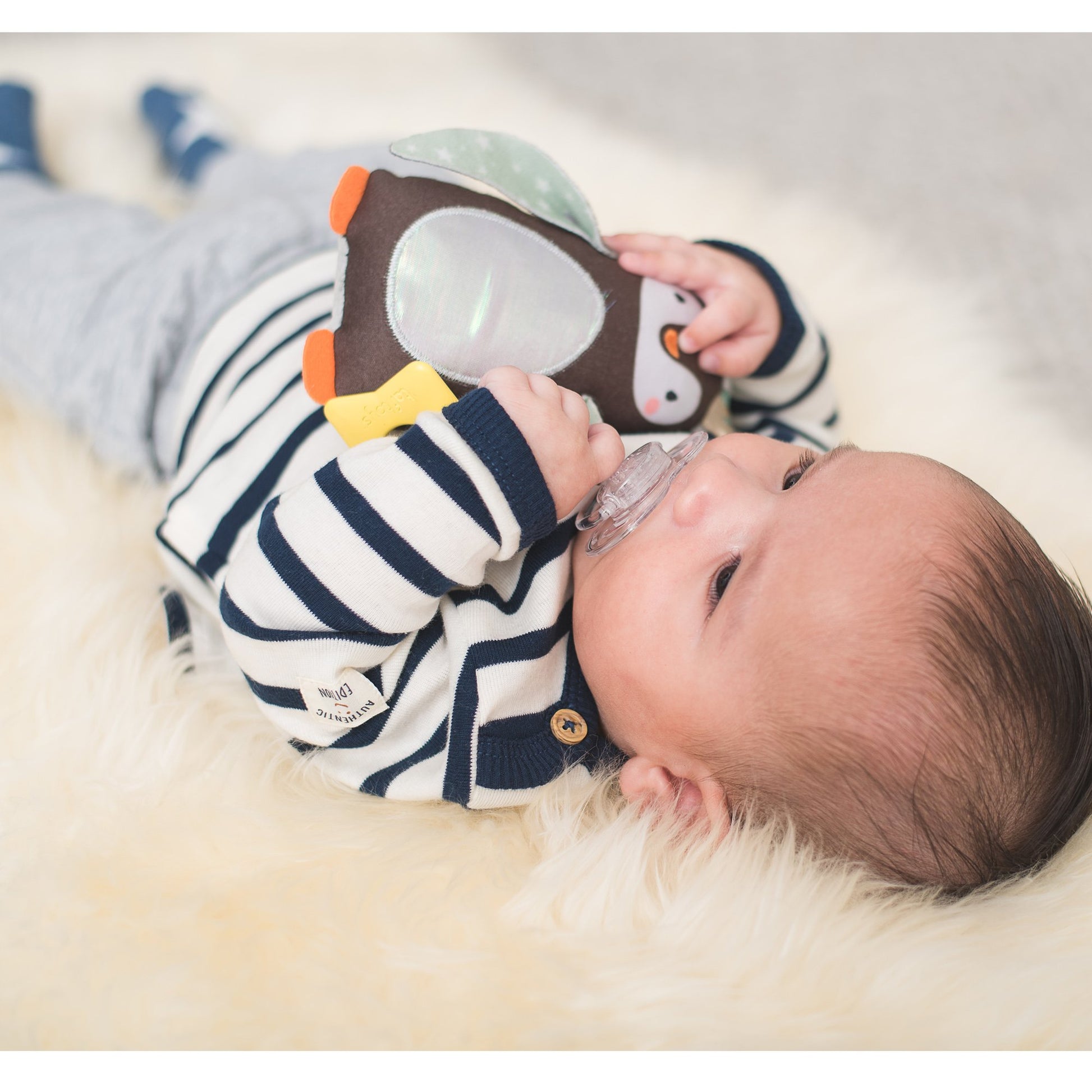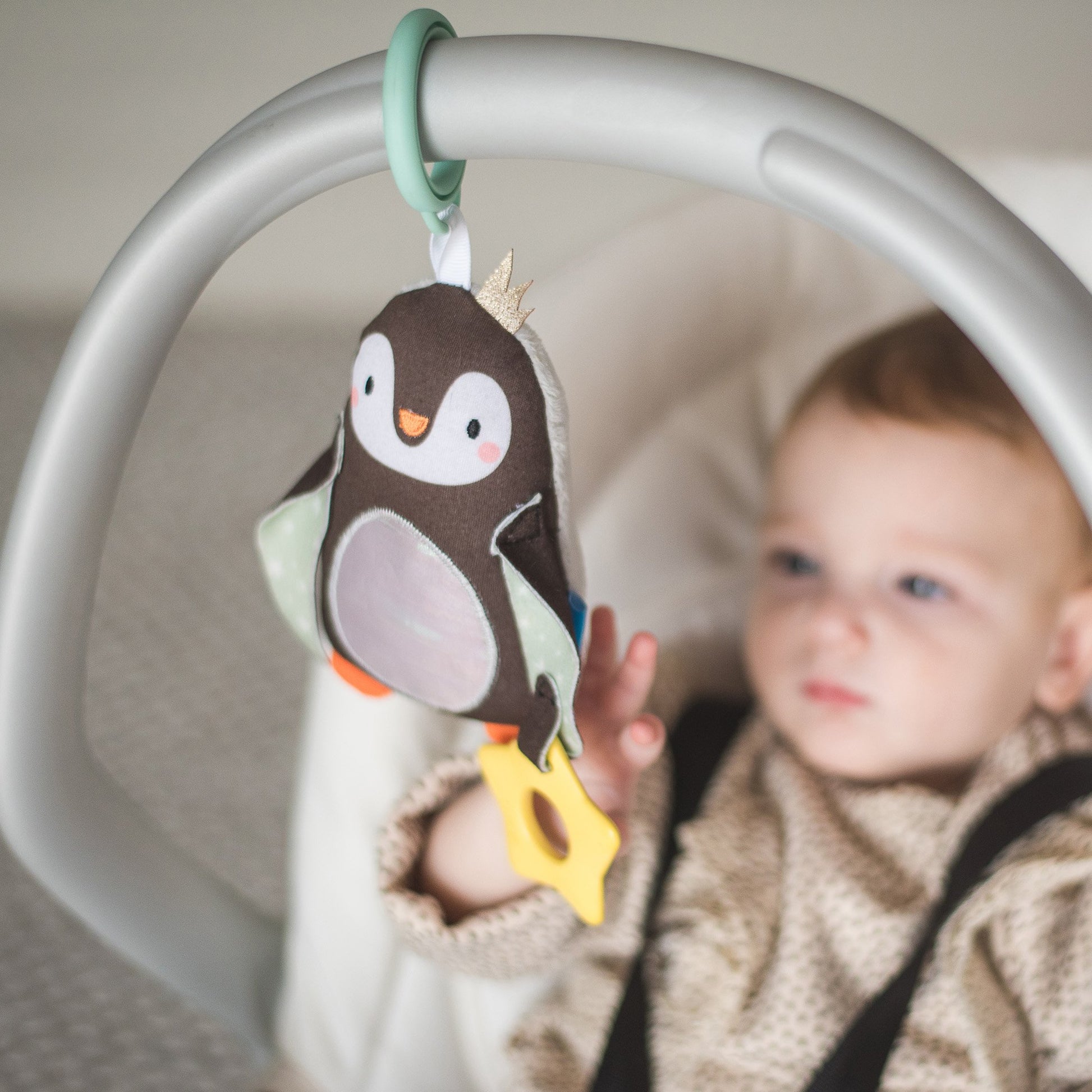 - Soft activity toy with chime bell sound, star teether and shiny fabrics.